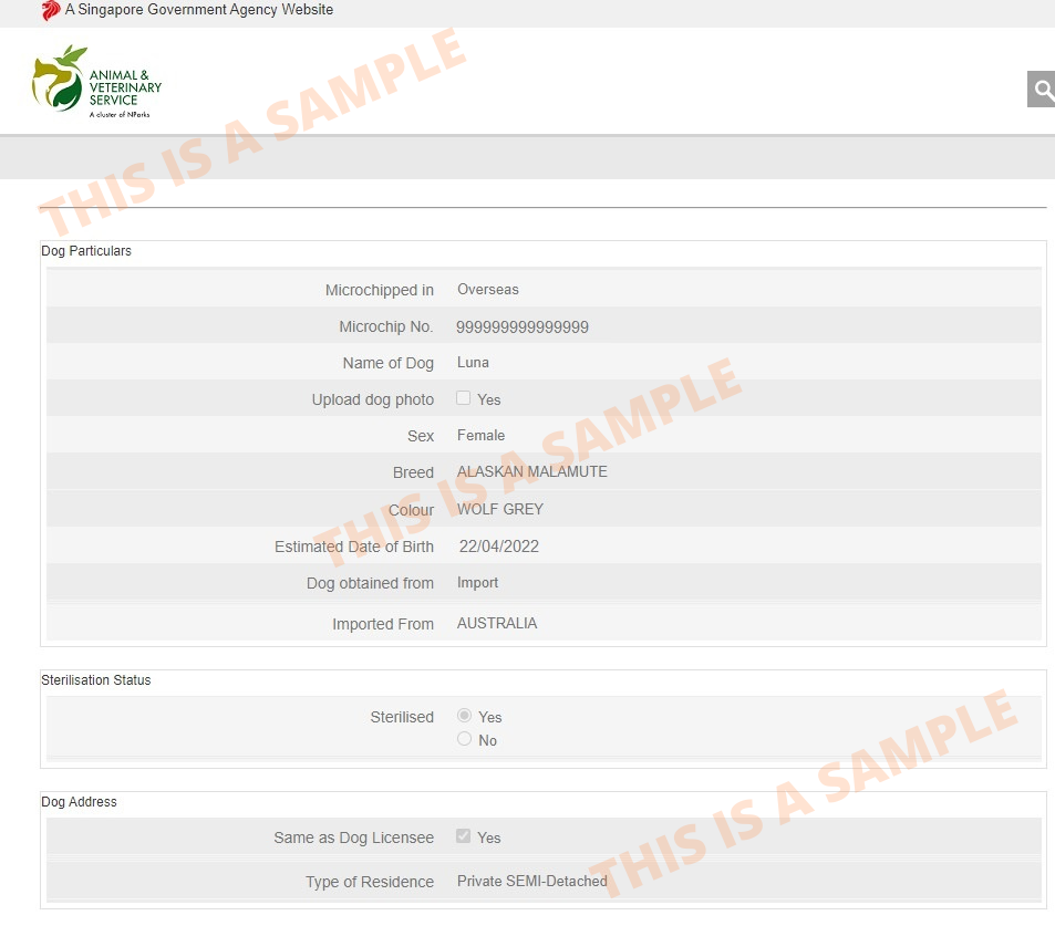 Sample Dog Particulars from AVS